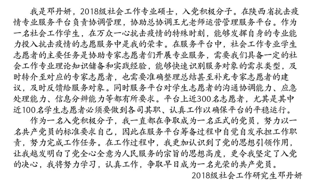 陕西省社会工作协会积极响应号召,借鉴武汉一线社工机构服务经验,构建了陕西抗击疫情专业服务支持体系(SMPC)。在师长的鼓励下,我院社会工作专业的研究生们积极参与此次支援,他们以志愿者的身份,严格遵守支援“团队服务手册”相关要求,采取轮班上岗制度,于早9:00到晚9:00 在岗工作,积极为有需要的居民朋友们提供医学指导、心理疏导、情绪管理、陪伴支持等专业服务。工作期间,他们严格依照每3小时进行轮班换岗的原则,确保对每一位服务对象的问题能够都能够及时积极回应。志愿者们虽然分工不同,各司其职,但都在各自的岗位上努力践行着身为社会工作者的使命,诠释着青年人对国家义不容辞的担当,让我们一同走进他们,体悟青春在抗“疫”战线绽放的感动瞬间!