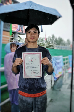 冒着扑面而来的大雨,纪永前同学以突出的体育素养和不屈拼搏精神在男子1500米决赛斩获第二名,